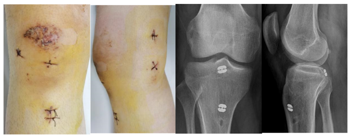 经评估,余敏团队为这两位患者实施了关节镜下微创手术,通过在膝关节周围做2个小切口,将关节镜插入关节腔内,医生可以清晰地观察到关节内的情况以进行精准的骨折块复位,并使用特殊的器械固定。这类手术创伤小、恢复快,而且不需二次手术取出内固定物,术后患者没有明显的疼痛,膝关节功能恢复理想,患者感受很好。
