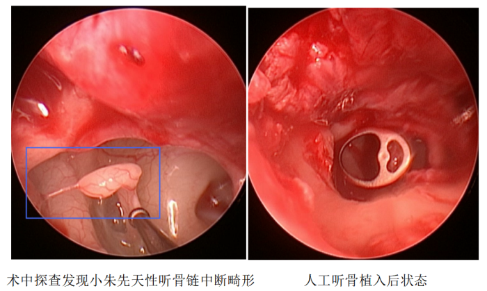 入院后,龚巍主治医师迅速为朱云轩完善术前检查及准备,并于次日在冯永教授的带领下完成右耳探查手术。通过耳内镜下手术探查,发现患者为先天性听骨链畸形,具体为砧骨发育畸形,砧骨长脚缺如,残余豆状突连接于镫骨,导致听骨链中断,因中耳传音结构异常从而表现为传导性听力下降。在冯永教授的带领下,植入人工听骨,替代中断的听骨,小朱有望恢复基本正常听力。