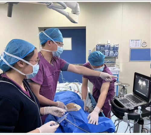 术前,刘松华团队利用超声对刘婷进行了细致评估,反复确认神经阻滞靶点、穿刺路径,探查周围畸变的解剖结构,并对气道进行了全面超声检查。术中,刘松华采用超声引导下的神经阻滞技术替代传统局麻,有效阻滞手术切口区域。宝宝安全娩出后,仅使用少量全麻药物便平稳完成了剩余手术。在多学科团队的完美协作下,这场高难度手术麻醉最终大获成功,获得了患者及家属的高度赞誉。