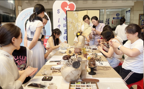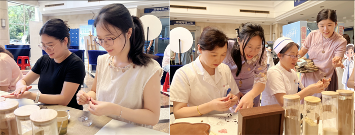 中医手作坊区域,医务人员围坐一堂,将檀香、玫瑰花、沉香等中药材与香珠巧妙结合,亲手编织出玫瑰合香珠手串,不仅传递着中医养生的温润哲思,更让传统文化在青春群体中焕发新生。