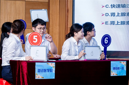 医师节当天,知识竞赛氛围紧张激烈,八支团队各选派2名代表参赛。各团队依次回答10道题,题目涵盖急救最新指南、罕见急症处置等核心知识,既考验对专业内容的精准记忆,也检验团队知识储备的全面性。答题成绩占决赛总分的30%,与技能操作成绩相加构成团队最终得分。