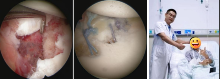 考虑到患者年轻且有强烈的运动需求,运动医学科团队为他实施了关节镜下微创修复手术。通过三个几毫米的小切口,精准地将撕脱的骨折块和盂唇组织复位到原位,并将它们牢固地重新固定在了肩胛盂上,恢复了肩关节稳定性结构,患者术后恢复良好,现已进入个性化的康复阶段。