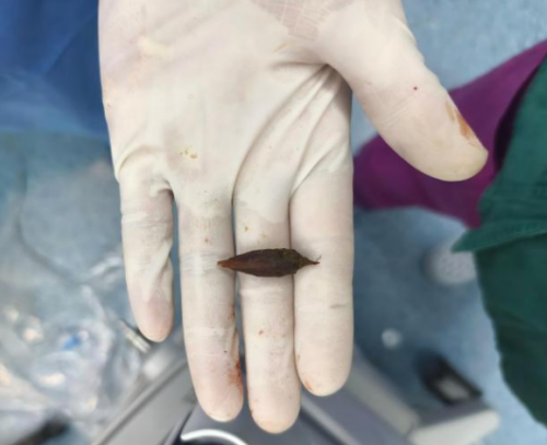 急诊医学科。经科副主任邵启兵和雷叶青主治医师团队迅速诊断,确认为枣核导致的消化道穿孔,病情危急。医疗团队紧急为其施行腹腔镜下探查手术,术中精准定位并成功取出一枚长约2厘米、两端尖锐的枣核,并对穿孔的肠壁进行了精细修补,及时挽救了患者生命。