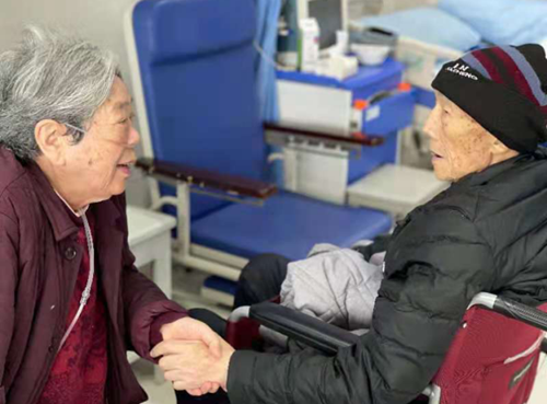 两位病重老人因专科疾病不同在我院不同科室就医,因病情需要都无法自行下床活动,以往很少分开的两位老人在与疾病斗争的同时都十分担忧对方的病情及康复情况。科室的护士们在和奶奶的聊天中了解到她对老伴的担忧,为解两老的相思之苦,在医务人员的帮助下,大家在呼吸与危重症医学科临时搭建了“夫妻”病房,安排两位老人在病房内重逢。