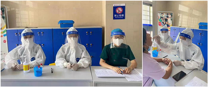 这是离血透室10米开外,血透室专门设立的核酸采集点。血透室护士负责核酸采集工作。血透室外没有空调,8月盛夏,护士们在高温下穿着隔离性极强的防护服,带着防护口罩及面屏,分分钟都是汗流浃背,但是大家的工作态度依然严谨。每一位血透患者及其家属严格按照疫情防控标准进行筛查。