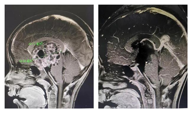 6岁的东东(化名)来自邵阳,自出生后生长发育就落后于同龄孩子,今年到了读书的年龄了,却还说不出完整的句子,只能说简单的几个字。一个月前,东东突然出现反复呕吐、呼吸困难、尿失禁,紧急送医后被诊断为“颅中窝巨大占位”,一个约52X46mm的肿瘤正是导致孩子病情的元凶。
