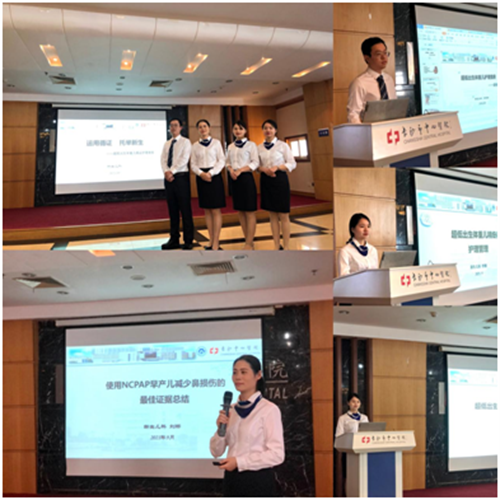 查房主要围绕成功救治一例27+3周体重仅890g的超低出生体重儿的护理案例展开。在新生儿科刘畅护士长主持下,主管医生邓书林、责任护士郭艳红分别介绍了患儿的治疗与护理,二级护士李娜分享了该患儿的精细化护理管理策略,并以视频的形式还原了该患儿争分夺秒的救治和日常精细化护理过程。最后刘畅护士长运用通俗易懂的语言介绍了循证护理的基本方法,讲解了如何将循证护理最佳证据总结应用于临床实践并以此降低NCPAP早产儿鼻损伤发生率的过程,让参会者更加直观的理解了如何运用循证护理方法解决临床问题。