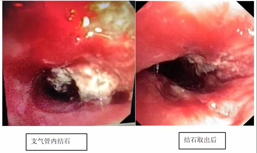 今年55岁年的杨菊英(化名)近几年来反复出现咳嗽、气喘,最近一个月,杨女士感冒后一直咳嗽不止,后来呼吸困难加重,在当地医院检查发现左主支气管狭窄,支气管镜都无法进去,建议转往我院呼吸与危重症医学科就诊,检查结果让她怎么也没想到,导致气管狭窄的竟是巨大结石在作怪。