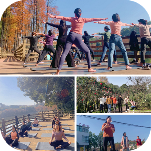 清晨,大家迎着初冬的暖阳来到了此次活动的第一站--湖南省植物园。园内空气清新、景色宜人,让人心旷神怡,瞬间忘掉烦恼。随后,大家兵分两路,有瑜伽爱好者跟着组长李艳容老师在园内练有氧瑜伽。其余的老师们一起参加趣味运动会:两人三足、夹乒乓球接力赛、你来比划我来猜等娱乐游戏。瑜伽可以让人全身心的放松,舒展。而趣味运动打破了彼此间不熟悉的尴尬,一起游戏,一起嬉戏,尽情的跑,尽情的跳,忘记了所有烦恼。