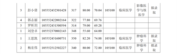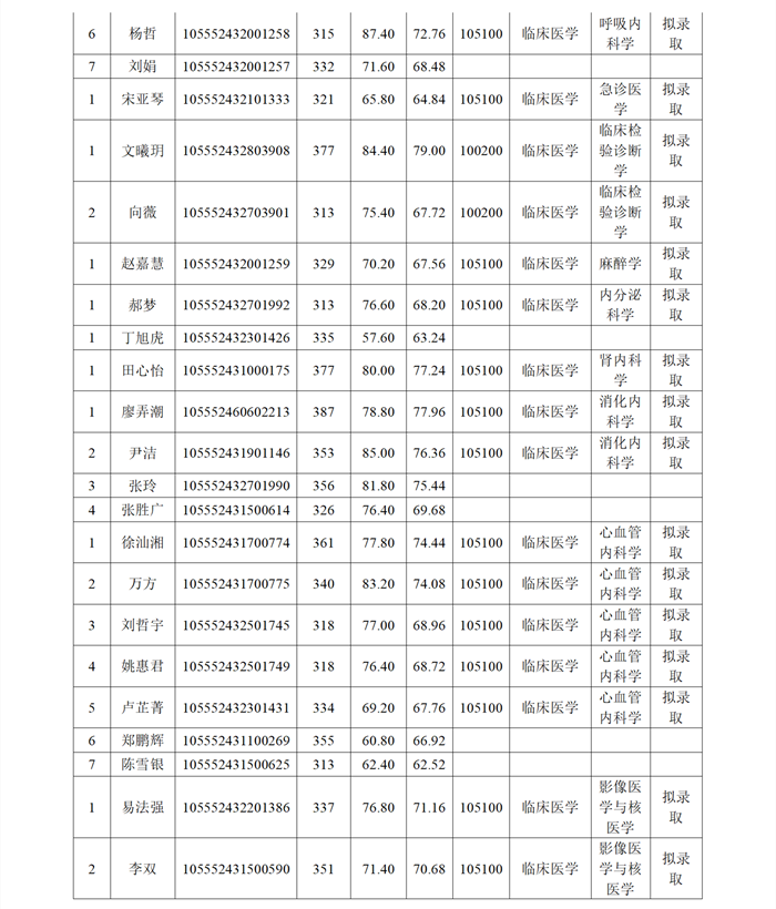 根据《南华大学2022年硕士研究生招生复试工作方案》《南华大学附属长沙中心医院2022年硕士研究生复试录取工作方案》,经南华大学附属长沙中心医院研究生招生工作领导小组审核,现将2022年硕士研究生一志愿拟录取名单予以公示,公示期为2022年4月9日-19日,如对复试结果有异议,请联系内部监督科,联系电话:0731-85668104。