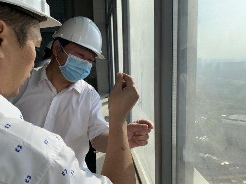 在十六楼的病房施工现场,肖玉坤详细了查看了病房的处置室、弱电井、新风机房、医生办公室等区域,实地勘查隔热玻璃的厚度、装饰装修材料的环保级别、工人施工的环境以及操作流程是否规范,现场协调解决项目建设过程中遇到的困难和问题。肖玉坤对病房室内的装修细节作出指示,要求各方齐心协力,科学调度施工力量,确保项目按期完成。