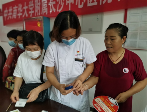 全科医学科党员邓红专、王艳霞及谭鑫等几位护士长,负责为就诊群众测量血压及血糖、登记和维持现场秩序,由于就诊人数较多,她们全程没有一刻停歇,小区业主们纷纷伸出了大拇指。