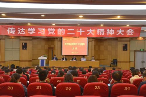 10月27日下午,我院在办公楼一楼国际学术报告厅召开传达学习党的二十大精神大会。会议由党委委员、副院长蔡岳祥主持,全体在院的党委班子成员、党总支和党支部书记以及中层干部参会。党委书记肖玉坤传达学习了二十大精神并讲话。