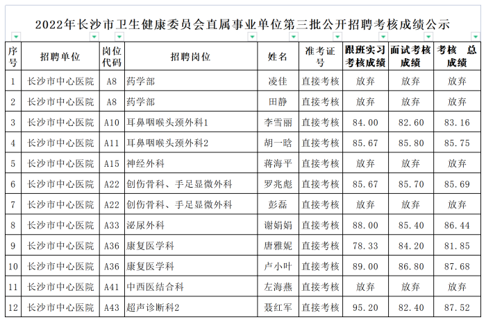 2022年长沙市卫生健康委员会直属事业单位第三批公开招聘考核成绩公示