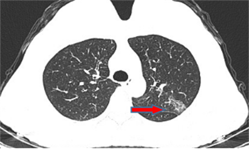 王女士,35岁,新冠核酸检查阳性7天,胸部CT检查左上肺磨玻璃影,考虑新冠病毒性肺炎。