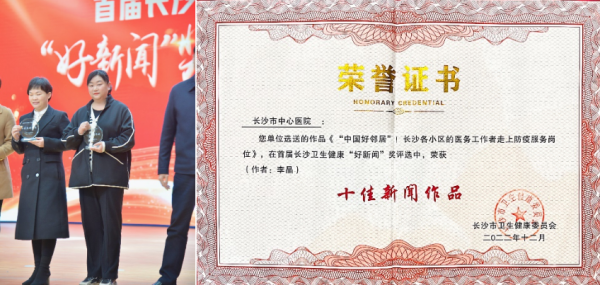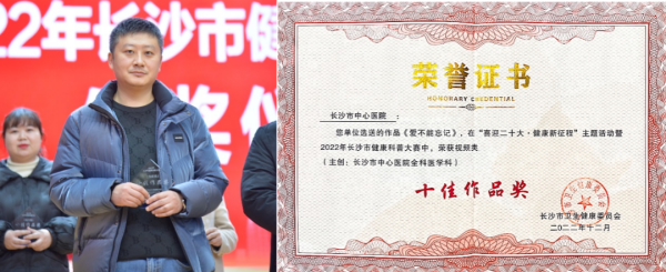 喜获“2022年长沙市新闻宣传先进单位”“2022年长沙市健康科普大赛组织奖”“长沙市2022年健康促进示范医院”等11项健康科普、宣传工作集体及个人荣誉,院党委委员、副院长蔡岳祥作经验交流,党委办朱文青则受邀分享抗疫故事。