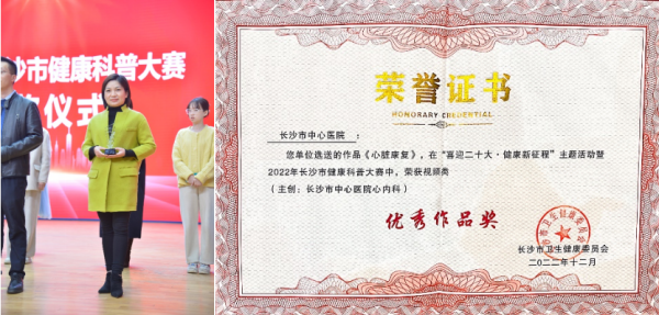 由心血管内科出品的健康科普视频《心脏康复》荣获2022年长沙市健康科普大赛健康科普作品(视频类、图文类)优秀作品
