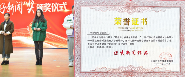 《“不放弃,孩子就有希望!”(践行核心价值观的长沙故事)——医生跑步时发现有人心跳骤停,坚持10分钟跪地心肺复苏挽回年轻生命》荣获首届长沙卫生健康“好新闻”奖优秀新闻作品。作者:赵春容、高琳