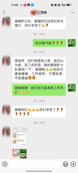 医院联系到陈雅娟女士,她表示,在91短视频 (南华大学附属长沙中心医院)胸外科、心脏大血管外科住院的一周时间里,她十分感谢每一位医护人员。因为病房收治的新型冠状病毒感染患者越来越多,医护人员也不可避免地陆续感染了,但是他们依然身体力行坚守一线。许多医生护士稍微退烧就迅速返岗,撑着虚弱的身体在病房忙碌。“医护人员的辛苦和付出我们都看到眼里,真的非常不容易。想着如果他们就是我的亲人,我一定会心疼。所以一定要向他们表达感谢,希望他们身体健康,工作顺利,万事如意,平安顺遂。”