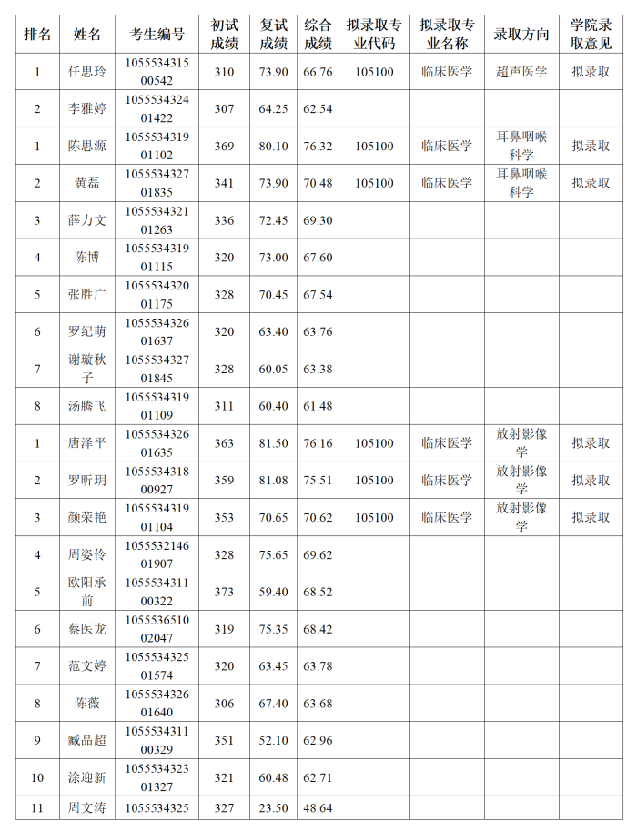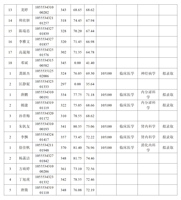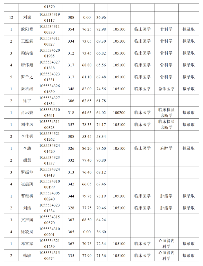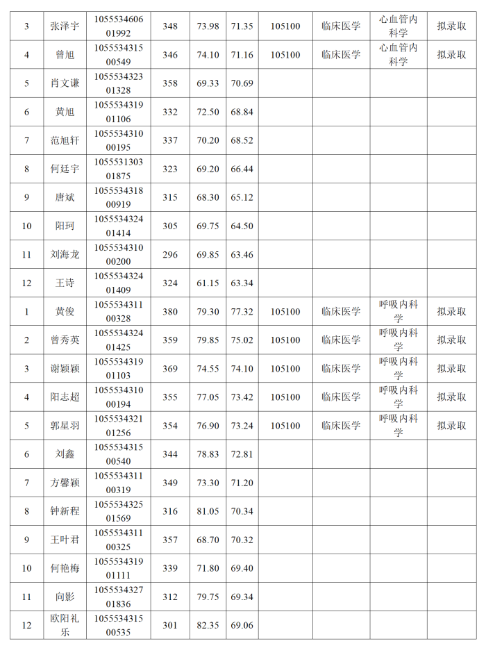 根据《南华大学2023年硕士研究生招生复试录取工作方案》、《南华大学附属长沙中心医院2023年硕士研究生复试录取工作方案》,经南华大学附属长沙中心医院研究生招生工作领导小组审核,现将2023年硕士研究生一志愿拟录取名单予以公示,公示期为2023年4月1日-10日,如对复试结果有异议,请联系内部监督科,联系电话:0731-85668104。