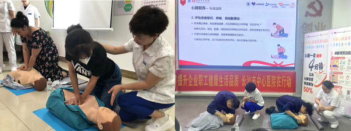 心血管内科党支部对公司的50多位员工分组进行培训。为了保证培训质量,提高实践操作水平,现场演示后,每个组员至少进行一轮心肺复苏技术实操。领班护士肖樱、朱艳芬逐一对大家进行指导,及时纠正,规范手法。赢得公司员工的一致好评。