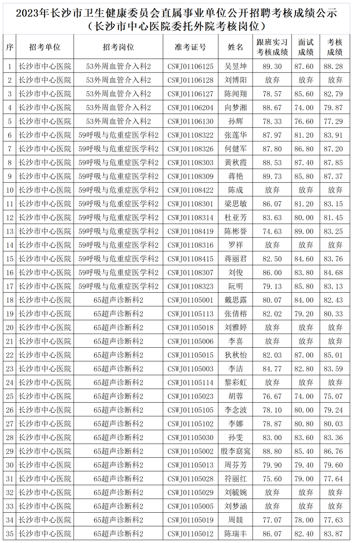 2023年长沙市卫生健康委员会直属事业单位公开招聘考核成绩公示