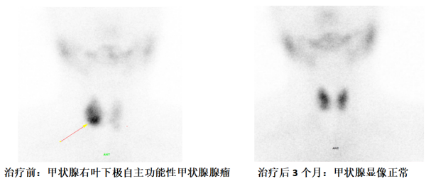 今年50岁的陈女士拿到结果非常担心,查询了网络资料后又怕结节是恶性肿瘤,一筹莫展之际,在朋友的推荐下至我院甲状腺疾病碘-131治疗门诊看病,经过检查后,李赛春主任告知患者甲状腺结节是良性的自主功能性甲状腺腺瘤,甲亢也是源于这个腺瘤,通过碘-131治疗就可以解决这些困扰,经充分评估和完善相关检查后,予以碘-131治疗,1个月门诊复查,陈女士自诉吃饭也正常了,不再饿得慌,怕热、多汗、心慌这些症状全没有了,3个月门诊复查甲状腺功能及甲状腺显像恢复正常,目前陈女士已完全康复。