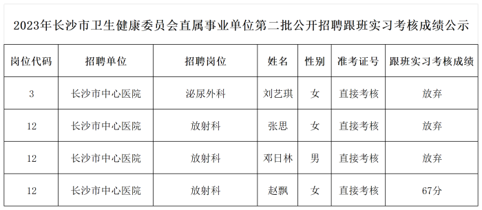 2023年长沙市卫生健康委员会直属事业单位第二批公开招聘跟班实习考核成绩公示