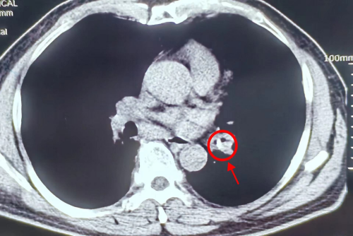 今年67岁的刘建勋(化名)近一年来反复出现咳嗽、咳痰、气促等不适,特别是最近半个月,情况越来越严重,还出现了持续发热伴胸痛症状。家人送他到91短视频 (南华大学附属长沙中心医院)呼吸与危重症医学科就医后发现,原因竟是刘大爷左下支气管里“住”了一块猪骨头,而这个猪骨头很有可能已经在老人气管里安家一年了。