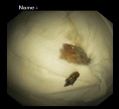 3月11日,医生为刘大爷行纤维支气管镜检查,镜下见左下支气管的管腔基本堵塞,生理盐水冲洗后发现一个异物嵌顿紧密,在医护人员的紧密配合下,经过多次小心翼翼的尝试,异物终于被取出。清洗干净后,医生发现异物竟然是一块长约1.2cm的猪骨头。