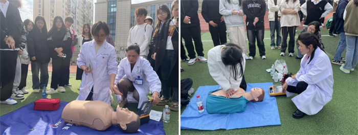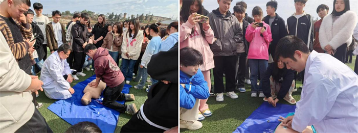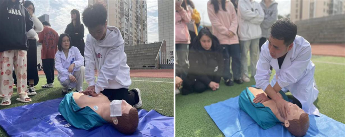 在技能操作演练环节,支部书记刘松华带领党员们分班分组进行心肺复苏及AED的现场操作示范。在阳光下,老师们手把手对学生们进行了耐心指导,同学们保持高度的学习热情,通过操作演练学习了心肺复苏的技能并初步掌握了急自救技能要点。