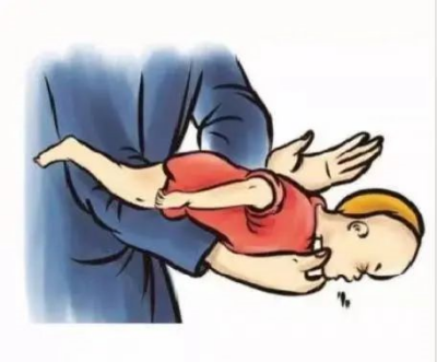 2、另一只手托住孩子后颈部,让其脸朝下,趴在救护人膝盖上。