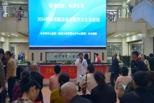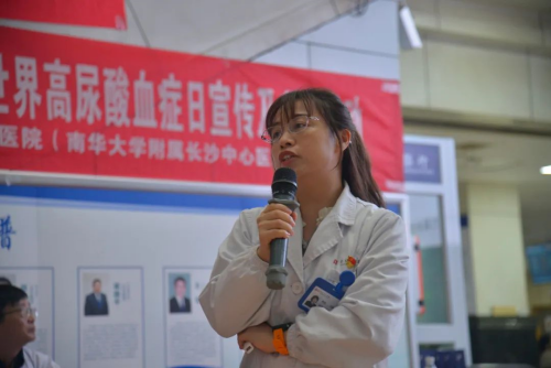 (南华大学附属长沙中心医院)内分泌科在医院门诊大厅举办高尿酸血症科普讲座及义诊活动。讲座现场,内分泌科副主任医师黄碧向市民详细解读了高尿酸血症的成因、危害及预防措施。
