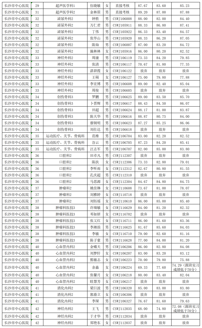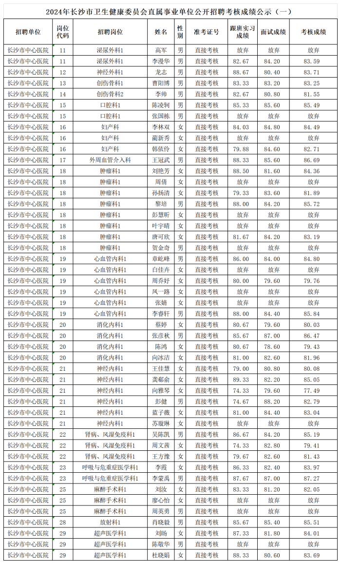2024年长沙市卫生健康委员会直属事业单位公开招聘考核成绩公示(一)