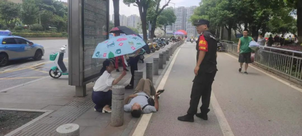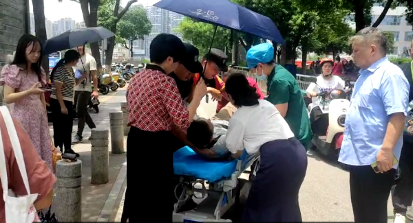 当时正值中午高温时段,医院工作人员谈慧经过事发路段,担心老人中暑,便蹲下来为老人撑伞降温,同时安慰他不要着急,等急诊科医护人员赶到后,众人帮忙一起将老人抬到担架车上,火速送往急诊科救治。