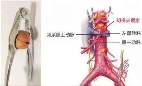 医生注意到,患儿身高132cm,体重只有40斤,整体偏瘦,再通过肾脏及肾血管彩超检查,最终找出了“罪魁祸首”,原来是左肾静脉从肾门出发途经腹主动脉和肠系膜上动脉搭建的“屋檐”时给予角度及空间太小、被夹紧,口径突然急剧变小导致血管压力过大淤血,甚至部分毛细血管破裂,故而尿里面出现血液,血液中红细胞破裂会释放出蛋白质,故而出现血尿蛋白尿。临床上称为“胡桃夹综合征”,除了对症治疗外,医生给患儿家属提了个建议:让孩子多吃些,长胖点。
