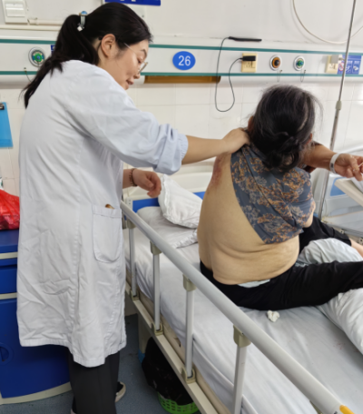 这位70余岁的苗族女性患者,身体健朗,独自一人生活,平时在田地种些青菜、玉米等农作物。一周前,老人左侧背部出现隐隐疼痛,她以为是自己农活做多了,想着休息下就能缓解了,还自行服用止疼药缓解疼痛。两天前,老人左侧胸背部疼痛加重,且出现了绿豆大的簇集水疱。这些水疱让她吃不下饭、坐立不安,夜里疼得难以忍受,剧烈的疼痛已经严重影响了她的日常生活。