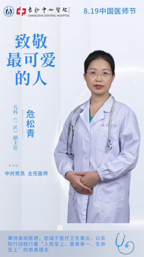 危松青,女,主任医师,儿科副主任,在复杂疑难病症诊断治疗方面积累了丰富的临床经验。从医27年来,始终坚守政治立场,秉持高尚医德,忠诚于医疗卫生事业,用实际行动诠释了医者的大爱与奉献,多次获得长沙市卫健委和医院的嘉奖,长期主管教学工作,多次获得教学奖项,是湖南省卫建委首批优秀住培带教老师。