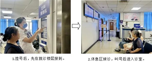 每层楼均设置排队叫号系统。结合“挂号时间”和“报到时间”统筹安排,推行“先报到后就诊”模式,实行“报到-排队-叫号”信息化就诊服务。