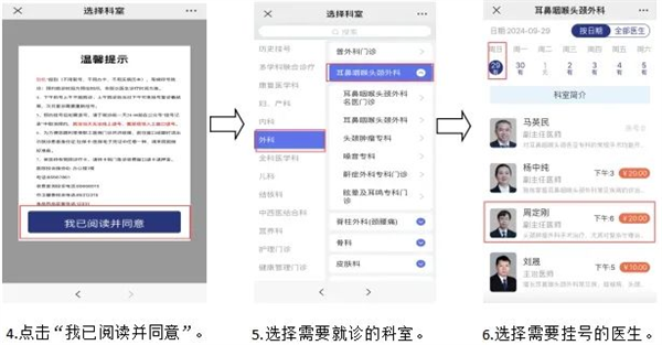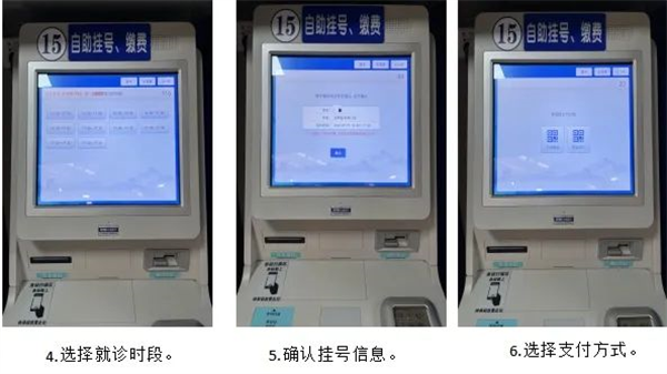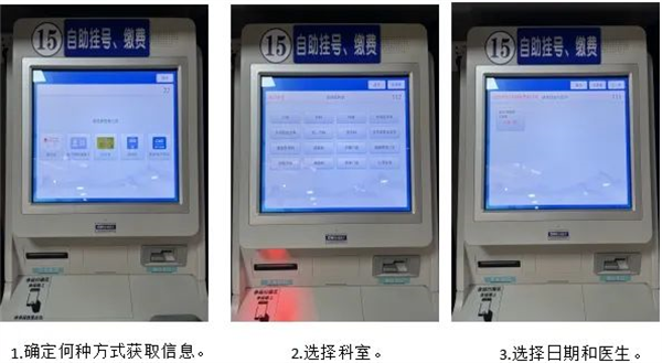 第三步:选择科室--选择日期和医生--选择就诊时段--确认挂号信息--选择支付方式--支付成功后领取小票--报到候诊。