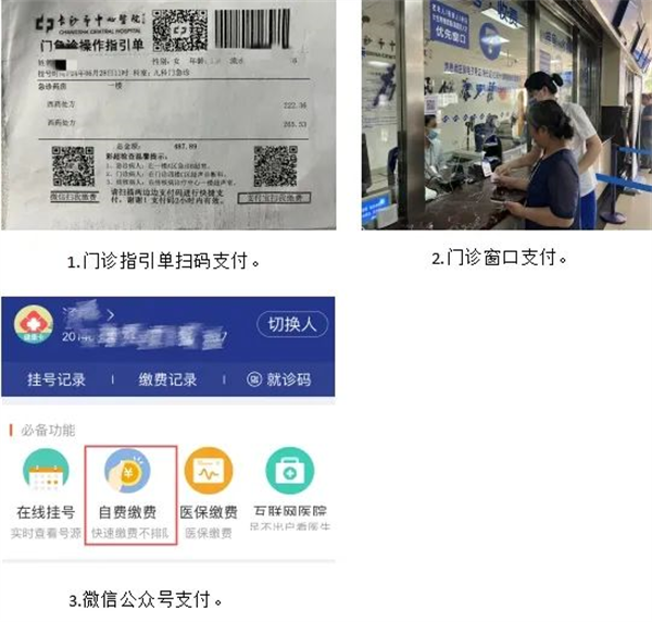 目前已开通门诊指引单扫码支付、微信公众号支付、第三方平台支付等多种线上缴费途径;除一楼人工窗口外,各楼层还分别设有人工窗口提供现场缴费服务。