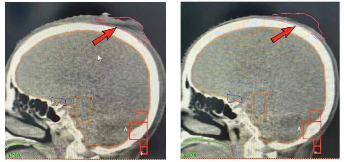 治疗前头皮可见突出肿块 放疗后头皮肿块明显缩小