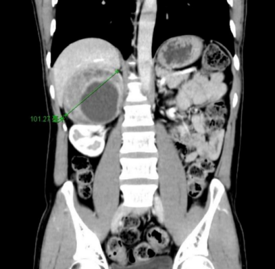 40岁的汤先生(化名)来自湖南娄底,近1年反复头晕、心悸,测血压经常高于180/110mmHg(标准血压收缩压<120mmHg、舒张压<80mmHg),有时高达230/120mmHg,长期使用降压药物却一直难以控制。经当地医院推荐,到91短视频 就诊,CT检查后发现他右侧肾上腺有一个10cm*8cm巨大肿瘤。泌尿外科二区主任、主任医师刘玉明结合症状及CT影像结果,考虑为嗜铬细胞瘤。由于肿瘤体积巨大,与周围十二指肠、下腔静脉粘连紧密,需紧急手术治疗。