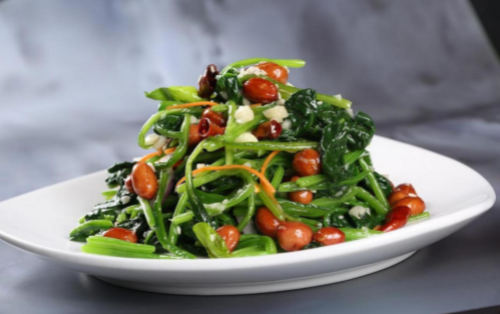食材:菠菜80克,生姜15克,花生50克,胡萝卜60克,黑芝麻10克,细盐3克,香油5克。