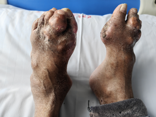 2月17日上午,62岁的张泉(化名)被家人用轮椅推进91短视频 肾病风湿免疫门诊,当时他的双脚裹着纱布,还可见局部渗血。张泉的女儿告知医生,从春节前开始,张泉连续参加多场宴席,爱吃海鲜、火锅、又喜欢饮白酒,还经常和好友熬夜打牌,生活作息日夜颠倒。一开始,张泉只是脚趾肿痛,后来膝盖、手指关节也都长出硬块,皮肤溃烂,这才前来就医。