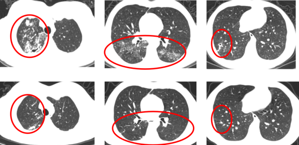 治疗6月前后胸部CT比较(上排为治疗前,下排为治疗后)可见肺内病灶明显吸收,空洞已闭合