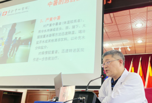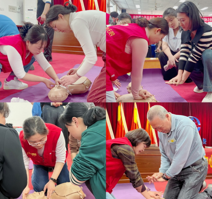 “急救能力是社会公民的‘必修课’,更是健康城市建设的‘软实力’,期待通过医企联动,将急救知识转化为守护生命的集体行动。之前科室就接诊过不少心肌梗死患者,幸亏及时进行了心肺复苏抢救,这就是‘黄金4分钟’的力量。”活动初始,医院急诊医学科党员、副主任医师杨志伟以真实案例切入,围绕中暑、电击伤、气道异物、外伤、常见传染病等急救主题,通过视频播放、实践操作、互动问答等方式,生动演示心肺复苏、海姆立克急救法等核心技能。讲解中,他反复强调“急救责任链”理念:“施救者既是技术执行者,更是现场指挥官——评估环境、呼叫支援、分工协作缺一不可!”