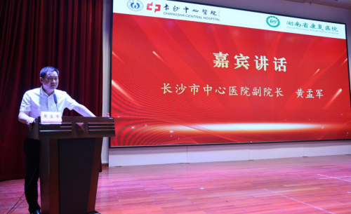 黄孟军在讲话中充分肯定湖南省康复医院的专业特色与服务理念,表示希望通过此次医联体合作协议的签约进一步发挥我院三甲综合医院优质医疗资源优势,推进院际放射治疗和PET/CT等检查设备资源及呼吸与危重症医学科、骨科、神经内科等优势专科资源共享,加强学科及科研领域的深度合作,共同推进医护康治研一体化,更好地为人民群众健康服务!