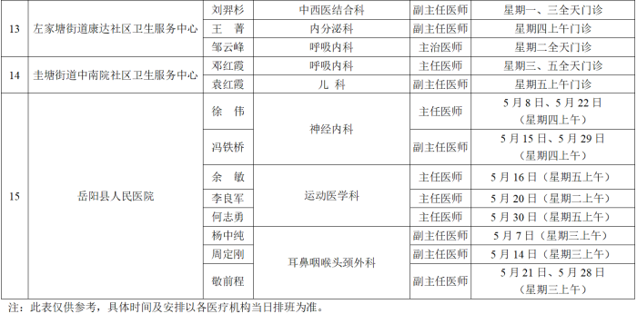 岳阳县人民医院坐诊时间:5月14日(星期三上午)