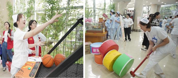 减压集市轻松怡然,妙趣横生。“妙手仁心抓抓乐”“心跳加速转转乐”“靶向投射准准乐”“健康减压锤锤乐”体验区,大家跃跃欲试,在真人抓娃娃、动感单车、真人投篮、一锤定音等减压互动中不知不觉中释放压力,收获欢声笑语。30年护龄工作者曹小华激动地感慨:“这场嘉年华既是荣誉的盛典,更是心灵的疗愈,大家都特别欣慰,我们守护患者健康,医院守护我们的幸福,这是双向奔赴的温暖,让我们更有力量前行。”